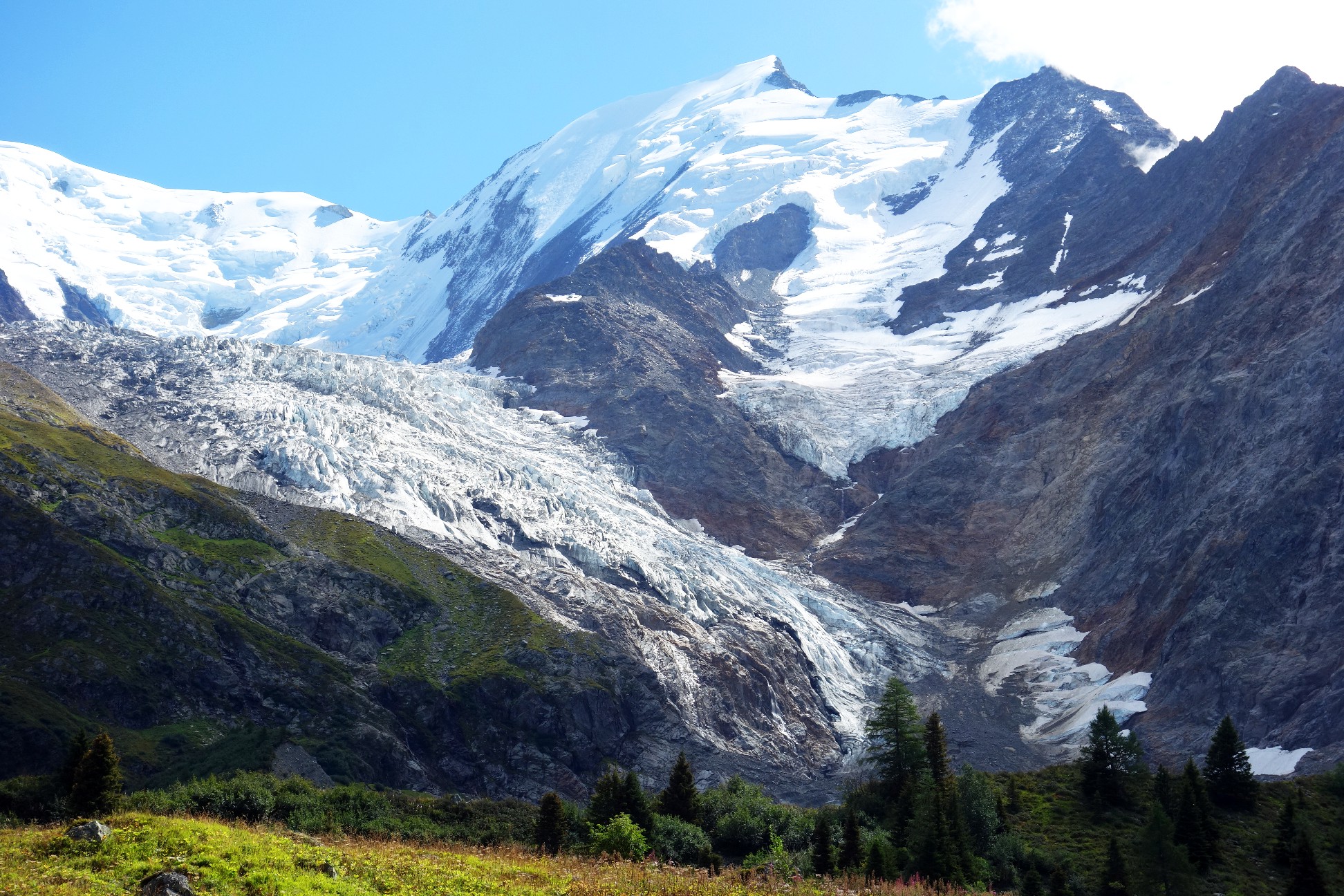 From here the track started to head around the mountain, across a sizeable footbridge to a lovely meadow below the huge Glacier de Bionnassay.